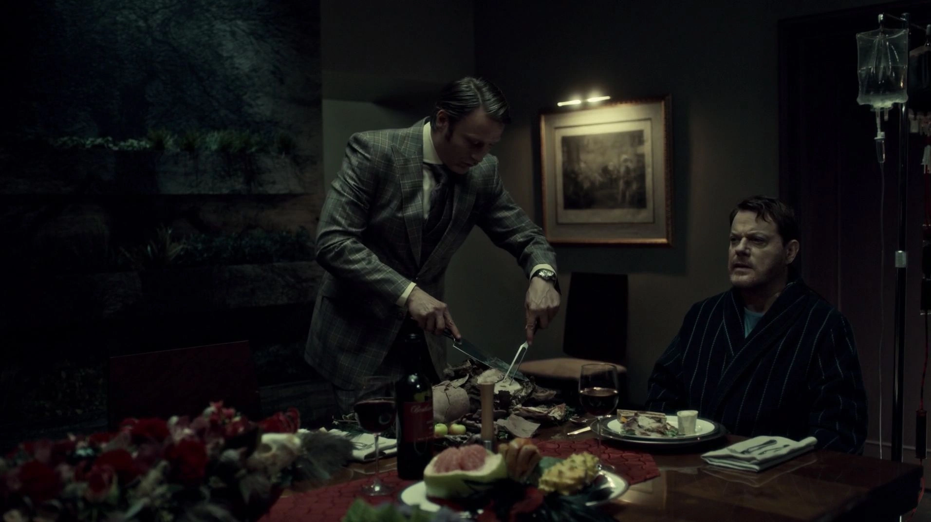 Momentos después, Hannibal prepara un exquisito asado sazonando la carne, envolviéndola en una enorme hoja de laurel y arcilla y llevándolo todo al horno. Al estar preparado, lo lleva hacia la mesa para servirlo a su invitado... Abel Gideon, llevando un albornoz y conectado a una vía intravenosa para recibir suero.