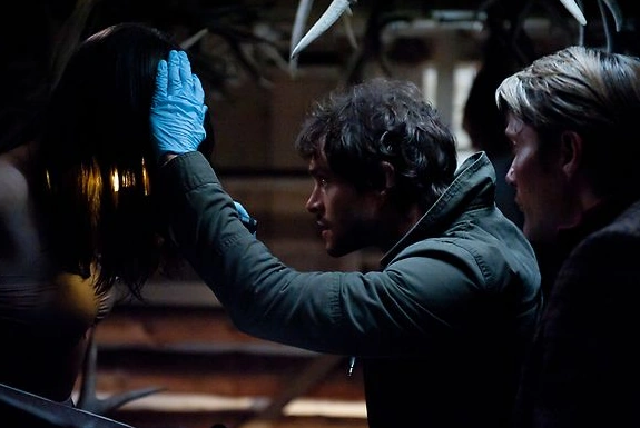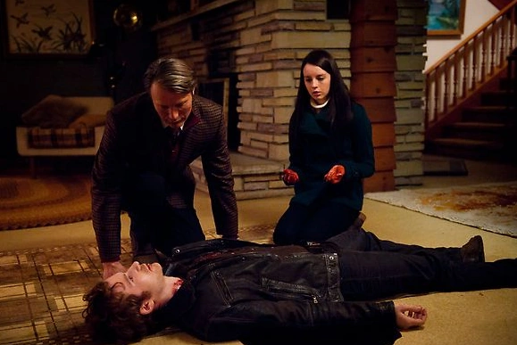 Alana is upstairs and calls down to Abigail. Hannibal spots her first, noticing a stunned Abigail walking toward the steps with blood covering her hands. As Alana comes around the corner, he goes behind her and knocks her out against the wall. He assures Abigail that Alana will be all right, then calmly asks her to show him what she's done. She does and Hannibal knows she'll never convince someone it was self defense. The narrative that will most assuredly play out if anyone finds out about Abigail's crime is that she was an accessory to all the previous murders, horrifying her. Seeing a step he could take to win Abigail’s trust, Hannibal offers to help her hide the body.